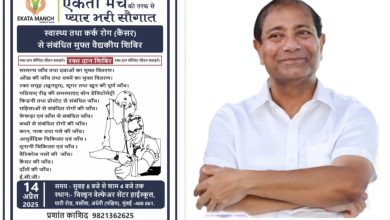एकता मंच तर्फे आयोजित आरोग्य आणि कर्करोग (कॅन्सर) संबंधित मोफत वैद्यकीय शिबिर आयोजित करण्यात येणार असून या शिबिराचे उद्दिष्ट समाजात…