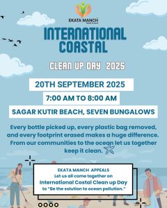 मुंबई (17 सप्टेंबर) – संपूर्ण जगभरात साजरा होणाऱ्या इंटरनॅशनल कोस्टल क्लिनिंग डे च्या निमित्ताने एकता मंचतर्फे सात बंगला सागर कुटी समुद्रकिनारी विशेष स्वच्छता मोहीम राबविण्यात येणार आहे. या उपक्रमाचे नेतृत्व एकता मंचचे अध्यक्ष प्राचार्य अजय कौल सर करणार आहेत.